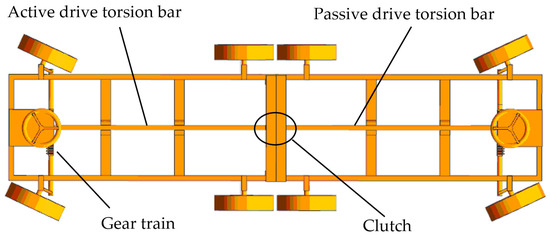 The butt joint of the chassis is mainly completed by the transmission torsion bar through screw locking, as shown in Figure 5. The two front and two rear wheels of the integrated vehicle are steering wheels. When the steering wheel is turned, the front and rear wheels deflect in opposite directions to achieve vehicle steering and maintain a small turning radius. As shown in Figure 6, the wheelbase L is 2150 mm, the distance S from the middle wheel to the tail frame is 450 mm, the value range of the deflection angle of the outer steering wheel is [30°, 40°], the maximum deflection angle is 40°, and the minimum turning radius of the vehicle calculated according to the Ackermann steering geometry is 3489 mm. It is lower than the current minimum turning radius of traditional minivan, which is 4500 mm.