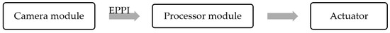 The visual positioning system is composed of an artificial beacon, a visual module, and an embedded image processing platform. The beacon is made of infrared luminous material and is placed above the three locking holes of the passive vehicle. The infrared camera is embedded in the active vehicle body. The vision module is responsible for automatic exposure control and image data acquisition, and it sends the image to the processor module through the EPPI (Enhanced Parallel Peripheral Interface). The processor module is the core part of the whole system, and is responsible for receiving the image data sent by the camera module, running the automatic exposure control algorithm and artificial beacon recognition algorithm, and outputting the final detection results to the actuator through the serial port for graphic comparison and movement. Figure 7 shows the working principle of the visual positioning system.