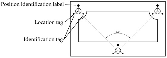 Tag image acquisition is realized with the camera imaging module, which is composed of the OV2640 optical chip and the Omni Visio lens. The road sign position identification label is composed of three marking points, which are fixed above the three locking holes of the passive rear frame. The location tag is surrounded by the identification tag, as shown in Figure 8. The principle is to ensure that there are no blind areas in the moving range of the active vehicle body during the docking process. The infrared light source of the driving car adopts near−infrared light and an 850 nm light−emitting diode. To reduce the interference pixels of ambient visible light, a narrowband filter (corresponding band) is set in front of the camera lens to ensure that only the artificial beacon is imaged. Image processing, i.e., binary processing, is carried out after road signs are collected. Feature extraction of the marked points in the binary image is performed, and then, the clustering processing is carried out to calculate the tag combination. Finally, according to the triangle formed by three marker points, the identity information of the label is extracted. The position and azimuth of the camera relative to each tag’s coordinate system are calculated by the tag position information calculation module. The label coordinate system that identifies the marked points according to the three positions is called the landmark coordinate system. To calculate the relative relationship between the camera coordinate system and the landmark coordinate system, the rotation matrix and translation matrix between the two coordinate systems are derived.