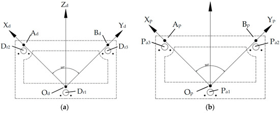 First, the camera coordinate system and landmark coordinate system are established, as shown in Figure 9. The origin of the active car body’s camera coordinate system is the intersection of the optical axis of the camera and the light−sensitive chip, which is located at the point Od above the fine pupil of the tail frame of the active vehicle body, where the X−axis is the OdAd connection, the Y−axis is the OdBd connection, and the Z−axis is the direction along the optical axis outward, pointing to the target vehicle body. The camera coordinate system (active car body) is OdXdYdZd. There are three marking points, Op (lower center), Ap (upper left side), and Bp (upper right side), above the three lock bodies of the target car body tail frame. The origin of the landmark coordinate system is the marking point Op of the lowest center. The OpAp connection is in the X direction, the OpBp connection is in the Y direction, and the vertical outward direction is in the Z direction. The landmark coordinate system (target car body) is OXpYpZp. The location coordinates of the three marked points of OAB are (0,0,0), (L,0,0), and (0,L,0), and L is the distance of OA. Mapping relationship of camera coordinate system and guide coordinate system is shown in Figure 10.