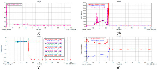 Simulation results of Condition 2. (a) Top view of docking car body under Condition 2. (b) Kinetic energy curve of D−vehicle and T−vehicle. (c) Total kinetic energy of system. (d) F−situation of the D−vehicle’s docking rod in advancing process. (e) Vehicle body collision counteracts the stress condition. (f) Change of relative speed between D−vehicle and T−vehicle.