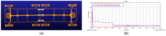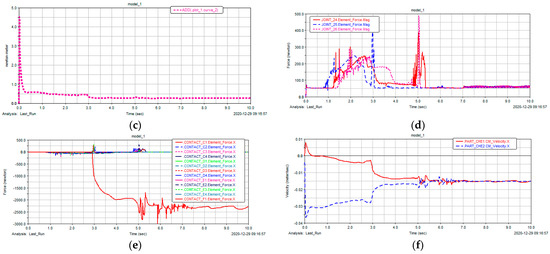Simulation results of Condition 1. (a) Top view of docking car body under Condition 1. (b) Kinetic energy curve of D−vehicle and T−vehicle. (c) Total kinetic energy of system. (d) F−situation of the D−vehicle’s docking rod in advancing process. (e) Vehicle body collision counteracts the stress condition. (f) Change of relative speed between D−vehicle and T−vehicle.