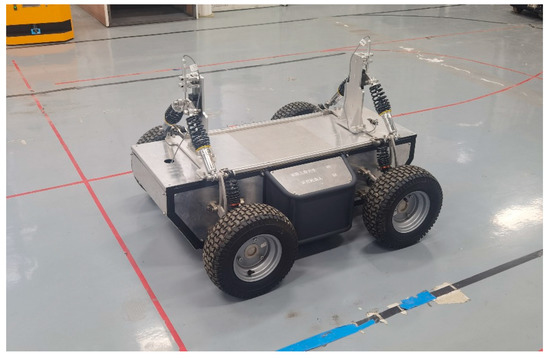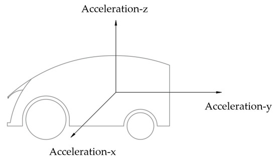 The reconstructed sample vehicle weighs about 100 kg, adopts double wishbone suspension for vibration reduction, and has four−wheel drive, as shown in Figure 13. The drive motor is an Oniki DC servo motor. The drive motor is built into the car body and is driven by a synchronous belt and a universal joint. The tires are golf cart tires with a radius of 160 mm. They are durable and reliable with a large contact area. Gyroscopes are installed inside, which can collect lateral acceleration (X), longitudinal acceleration (Y), vertical acceleration (Z), and changes of some angles of the whole vehicle in real time. The body orientations of the three accelerations are shown in Figure 14. Four motor drivers rotate the motor to realize the moving, retreating, steering, and local rotation of the vehicle.