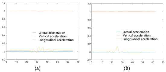 Like the dynamic simulation, the experiment is also conducted for two working conditions. The changes of kinetic energy and force during collision are determined in the dynamic simulation, whereas acceleration is measured by the gyroscope of the reconstructed sample vehicle in the experiment. Both kinetic energy and force are parameters related to acceleration; thus, it is sufficient to record and study the acceleration, as shown in Figure 15.