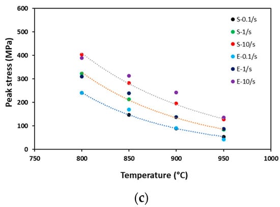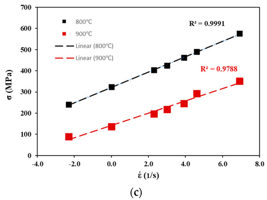 Figure 3. Simulated peak stress vs. linear strain rate at 800 and 900 °C for (a) Ti-4.5Al-1V-3Fe; (b) Ti-6Al-1V-3Fe; and (c) Ti-6Al-4V.
