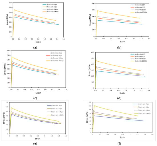 Figure 4. Flow stress obtained from DEFORM-3D simulation at high strain rates for (a) Ti-4.5Al-1V-3Fe at 800 °C; (b) Ti-4.5Al-1V-3Fe at 900 °C; (c) Ti-6Al-1V-3Fe at 800 °C; (d) Ti-6Al-1V-3Fe at 900 °C; (e) Ti-6Al-4V at 800 °C; and (f) Ti-6Al-4V at 900 °C.