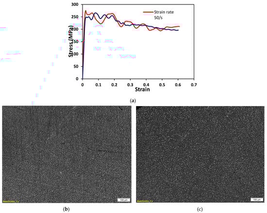 Figure 5. (a) The uncorrected flow stress of commercial Ti-6Al-4V obtained from the Gleeble 3500 uniaxial compression experiment and corresponding optical images at (b) 20/s; and (c) 50/s strain rates.