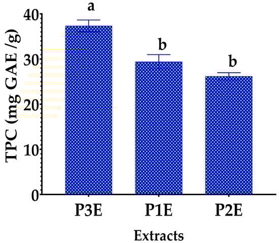 The TPC results were given in milligrams of gallic acid equivalent per gram of extract. Figure 1 shows that TPC in the P1E, P2E, and P3E is 29.38 ± 1.570, 26.15 ± 0.823, and 37.33 ± 1.307 mg GAE/g, respectively. The TPC value in the P3E sample is high compared to the P1E and P12 samples, and this difference between the values is significant (p < 0.05). Comparing our values obtained of TPC from three studied samples with the results of previous researches, the obtained values of TPC in the three extracts are higher than those of the fresh petals’ hydroethanolic extract and the basal leaves’ methanolic extract, at 14.30 mg GAE/g of fresh petals and 25.86 mg GAE/g of extract, respectively [41,42]. Additionally, our obtained TPC values in whole plant extracts of three samples are higher than those obtained in hydroethanolic extracts of four organs of P. rhoeas: flower, leaf, stem, and root, at 22.10, 24.24, 10.58, and 10.22 mg GAE/g, respectively [33]. In addition, the TPC in the dried pollen extract of our study plant is approximately similar to our values obtained at 34.8 mg GAE/g [43]. The most abundant metabolites detected in the Papaveraceae family are alkaloids. (+)-rhoeadine was found to be the most abundant alkaloid isolated from the aerial portions of P. rhoeas. Allocryptopine, berberine, protopine, coptisine, coulteropine, (−)-sinactine, (+)-isocorydine, sanguinarine, (+)-rhoeagenine, and (+)-roemerine were the minor alkaloids [44]. These alkaloids, particularly those of the isoquinoline type, are the most significant in terms of pharmacology [45,46]. The antioxidant [47,48,49] and antimicrobial [50] properties of Papaver alkaloids are well established.