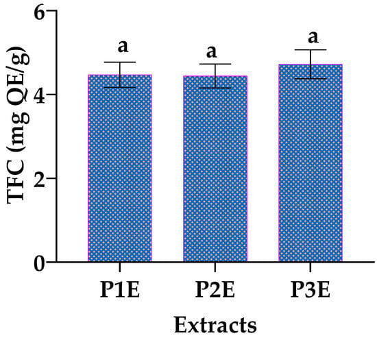 Flavonoid content in PE1, PE2, and PE3; QE: quercetin equivalents; a: the difference between the three samples was not significant (p > 0.05).