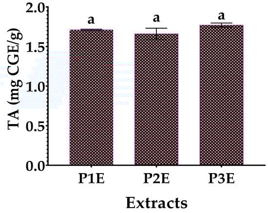 The TA in the studied extracts PE1, PE2, and PE3 was highly unified 1.71 ± 0.008, 1.66 ± 0.070, 1.77 ± 0.026 mg CGE/g extract, respectively (Figure 3). The difference in TA values in the three samples was statistically not significant (p > 0.05). Comparing our TA values with previous studies, a Serbian study showed that the total content of monomeric anthocyanins in all studied extracts ranged from 4.72 to 5.3 mg CGE/g of fresh petals. The values of total monomeric anthocyanin content do not differ significantly in ethanolic, aqueous, and methanolic extracts [41].