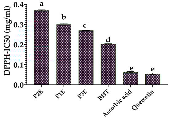 The antioxidant properties of three P. rhoeas extracts were evaluated using the DPPH method. Figure 4 illustrates the IC50 data achieved in this test. The IC50 values for P1E, P2E, and P3E are 0.30 ± 0.006, 0.37 ± 0.003, and 0.27 ± 0.001 mg/mL, respectively. The difference in IC50 values between the three samples studied is significant (p < 0.05). The IC50 values for reference molecules: butylated hydroxytoluene (BHT), ascorbic acid, and quercetin are 0.20 ± 0.004, 0.062 ± 0.004, and 0.054 ± 0.004 mg/mL, respectively. The IC50 values obtained for the three samples studied are relatively higher than those for standard molecules. The difference in IC50 between the three samples studied and these reference molecules is statistically significant (p < 0.05). Comparing the IC50 values obtained with previous literature, the IC50 of Moroccan P. rhoeas flower extract (Soxhlet and maceration) is 3.81 and 4.97 mg/mL, respectively [39]. Furthermore, in a recent Moroccan study, the IC50 of the four organs (flower, leaf, stem, and root) of P. rhoeas were 0.52, 0.50, 1.56, and 2.12 mg/mL, respectively [33]. In addition, the acetone, ethanolic, and aqueous P. rhoeas leaves extracts had IC50 values of 5.49, 3.11, and 1.39 mg/mL, respectively [12].