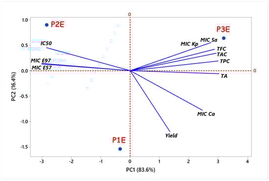 Principal component analysis (PCA) is a powerful method for extracting data from multivariate matrices because it portrays the data as a set of a few orthogonal variables [60]. The parameters are displayed in blue, while the samples are plotted in red (Figure 6). The first component represents (PC1) 83% of the variation in the data, while the second component (PC2) represents 16%. PC1 is positively correlated with TPC, TFC, TA, TAC, MIC Kp, and MIC Sa. Therefore, a negative correlation can be observed between the same principal component and IC50, MIC E. coli ATCC, and MIC E. coli CIP. In addition, the PC2 is positively correlated with IC50 and MIC E. coli ATCC and MIC E. coli CIP, so it is negatively correlated with MIC Ca, TA, and yield.