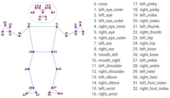 In this paper, MediaPipe Pose (MPP), an open-source cross-platform framework provided by Google, was employed to attain estimates of 2D human joint coordinates in each image frame. MediaPipe Pose builds pipelines and processes cognitive data in the form of video using machine learning (ML). MPP uses a BlazePose [] that extracts 33 2D landmarks on the human body as shown in Figure 1. BlazePose is a lightweight machine learning architecture that achieves real-time performance on mobile phones and PCs with CPU inference. When using normalized coordinates for pose estimation, inverse ratio should be multiplied to the y-axis pixel values. Among the estimated MPP landmarks, we used 12 landmarks to estimate arbitrary poses and motions, which indices are 11, 12, 13, 14, 15, 16, 23, 24, 25, 26, 27, and 28, as shown in Figure 1.