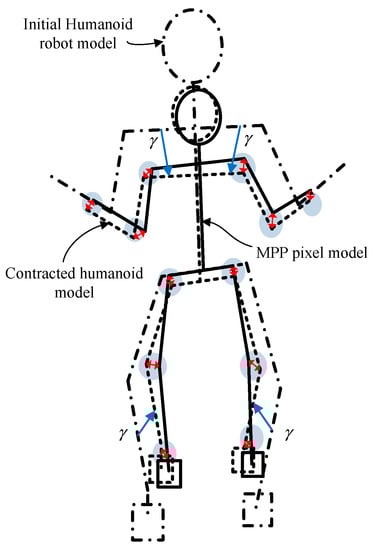 For an estimation of the joint angles in the humanoid model that fits well with the MPP skeleton model for the current frame, inverse kinematics is basically necessary. However, it takes a long time to solve the formula-based inverse kinematics of the humanoid robot due to the complicated structure of the humanoid model, as shown in Figure 2.
