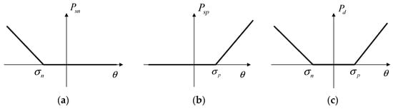Penalty functions for suitable joint angles. (a) single-sided negative function, (b) single-sided positive function, and (c) double-sided function.