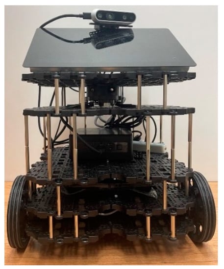For the proposed human pose estimation system, Intel NUC 11th i7 (NUC11TNKi7) was used as the SBC for camera image acquisition and joint estimation, and Intel RealSense is installed as a commercial RGB-D sensor. In the SBC, the CPU is a quad-core i7-1165G7 (4.7 GHz) and the memory is 16 GB DDR4. The HDD is SSD NVMe 480 GB, and the OS is Ubuntu 18.04. For a high-mobility pose estimation capability, these modules are installed on a mobile robot base, as shown in Figure 8.