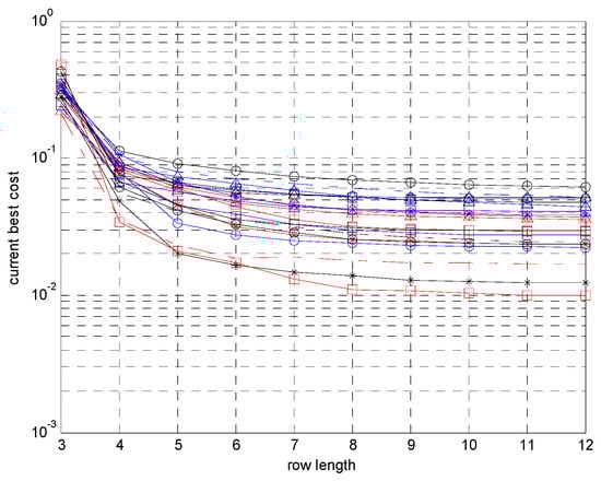 - Step 6. If , set . Go to Step 3. Otherwise, if the current string length m is shorter than the prescribed maximal row length , set , increase the row length index as , and go to Step 2. In the case of , go to Step 7.