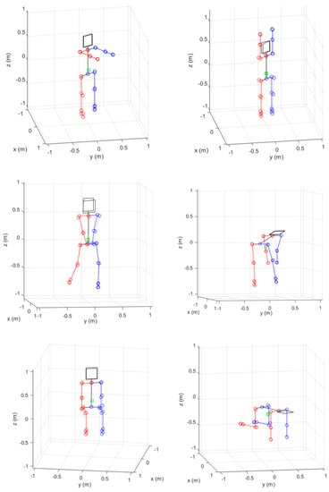 In general, humanoid robots are described with links and joints based on the Denavit–Hartenberg (DH) method [] in which a reference coordinate frame is placed on the supporting foot. Since the goal of the current approach is to generate and estimate poses of humanoid that are as human-like as possible, we improved our previous humanoid model [] to generate arbitrary poses as follows:
