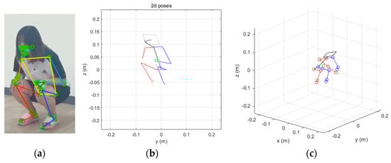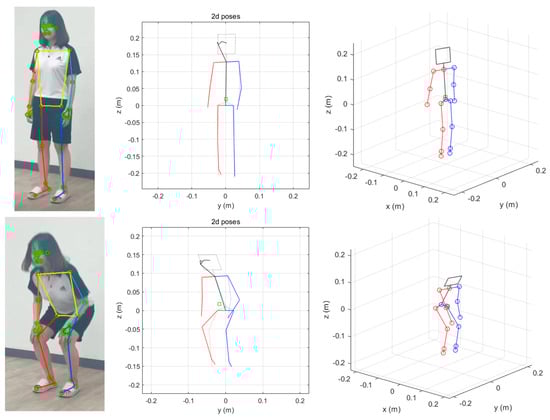 Figure 11 shows three poses captured and analyzed while standing and squatting. Figure 11a,b show the 2D poses estimated by MPP and the reprojected poses attained by uDEAS, and Figure 11c shows the reconstructed 3D poses.