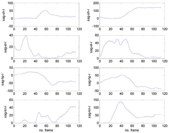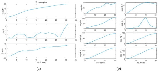 Figure 12 shows the trajectories of the estimated joint angles for the poses from Figure 11a–c. It is noteworthy that the sagittal hip and knee joints move from 0 to around 100 degrees, and the sagittal torso angles change from 0 to 60 degrees, which match the actual human joint angles rather well. These angle trajectories also provide information on the current stance, making them helpful for medical or therapeutic purposes.
