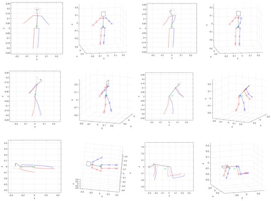 Results of the reconstructed 3D humanoid poses corresponding to Figure 13 (red line: right parts, blue line: left parts).