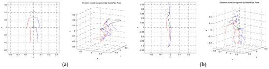 Actually, MPP estimates the depth data for each landmark as well []. As a validation of the depth estimation performance of MPP, Figure 17 compares two 3D standing poses estimated by the proposed method and MPP. As shown in the figure, the depth data of each joint estimated by the current version of MPP have large errors when compared with our results. The ratio of the 2D MPJPE and 3D MPJPE is 185.37 for the standing pose and 277.81 for the arm-raised pose. The latter pose is more twisted than the former one from the camera’s viewpoint, and thus the depth error leads to a more different pose. This result is why we have employed only 2D landmark information for recovering 3D human pose estimation in the present work. Even if the depth value is estimated almost exactly in the later version of MPP, our method can be applied as it is, and the 3D estimation accuracy is expected to be higher.