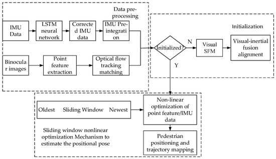 Neural network-assisted visual-inertial person localization framework diagram. The framework diagram is divided into three parts: data pre-processing, initialization, sliding window nonlinear optimization Mechanism to estimate the positional pose.