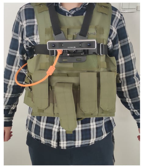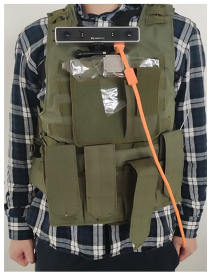 In order to verify the reliability of the improved algorithm, indoor and outdoor experimental scenarios are selected, and the underground space is simulated with indoor–outdoor experiments and tested several times. The localization device is placed on the wearable undershirt, the camera device is used, as shown in Figure 9. The experiments are conducted by pedestrians wearing the undershirt on outdoor roads and indoor hallways. The experimental comparison results and analysis are as follows: