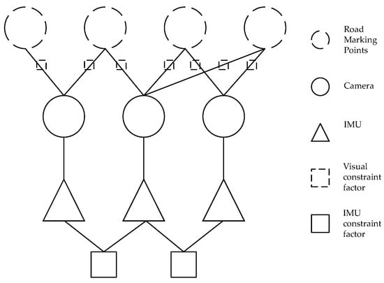 For the correlation of visual-inertial data, all visual-inertial state quantities in the sliding window can be optimized using a tightly coupled approach based on a graph optimization framework, and Figure 7 using a factor graph approach shows the constrained relationship between the camera, the waypoint, and the IMU.