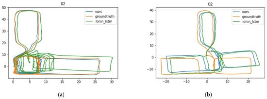 To evaluate the superiority of the proposed algorithm more intuitively, two sets of representative training results are selected in this paper: the first set has better training results and the second set has worse training results. As shown in Figure 8, the blue line is the trajectory generated by the algorithm, the yellow line is the ground truth trajectory, and the green line is the trajectory generated by the RONIN-LSTM method. From the figure, we can see that the trajectory generated by our algorithm in the first picture (a) basically overlaps with the ground truth, and the trajectory generated by the RONIN-LSTM algorithm deviates more seriously. In the second picture (b), both methods deviate, but the trajectory of our algorithm obviously deviates less than that of RONIN-LSTM. As can be seen in Table 2, both images show a significant reduction in ATE and RTE after training using the position loss function.