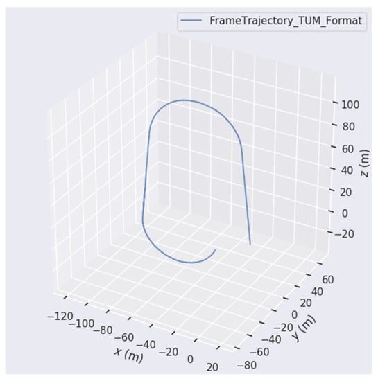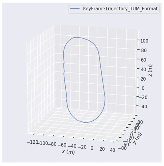 (1) Outdoor playground experiment. The experimental scene was chosen as a school playground, and the experimenter walked around the playground wearing localization equipment. To verify the effectiveness of the algorithm, the VINS-fusion algorithm and the improved localization method were used for comparison. The localization trajectories of the two methods are shown in Figure 10 and Figure 11. The total length of the trajectory is 400 m, and the accuracy is calculated by the offset distance and the total distance traveled. The endpoint of the improved positioning method is very close to the starting point, the offset is about 1.997 m, and the positioning accuracy error is 0.50%. As for the results of the VINS-fusion algorithm run, the positioning was relatively accurate for a short distance after the start, but the drift was more serious after that. After one lap, the endpoint of the positioning trajectory seriously deviates from the starting point. The offset is about 25.67 m and the positioning accuracy error is 6.41%. Positioning error is reduced by 92.20%. The comparison shows that the method proposed improves positioning accuracy.