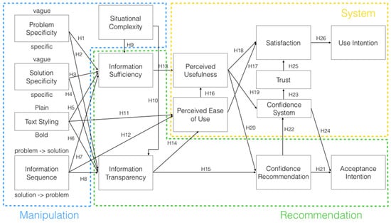For an RS to be successful with respect to its adoption, users should have confidence in the system-generated recommendations and trust the system [5]. Transparency plays an important role in users’ confidence in recommendations as it may encourage or deter users’ trust in a system [42,43], where recommendations perceived as transparent by users increase their confidence [44]. User perceptions of ease of use and usefulness are positively related to each other [12,45,46,47] and to system attitudes, such as those toward the system’s use and system satisfaction [12,40,46,47,48]. Moreover, explanations contribute to user trust in RSs [30,49,50]. Confidence in the system positively influences trust in the system [51] and the user’s behavioral intentions with the system, including their intention to accept a system-generated recommendation [40]; in addition, the degree of trust users put in the system plays an important role in the acceptance of a recommendation [52]. In the context of I.S. use, trust has been shown to positively affect satisfaction [53], which in turn has been shown to encourage use of the system [54,55]. Hence, the following hypotheses were proposed: