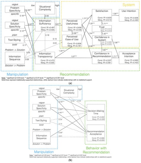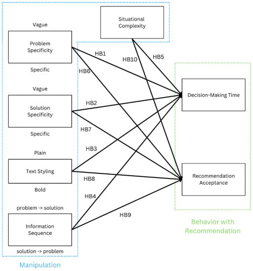 In addition to the observed effect of information specificity on decision-making time, it was also observed that users were significantly more likely to accept the recommendation if the messages stated specific (rather than vague) problems (HB6: b = 0.3006, p < 0.0001) and specific (rather than vague) solutions (HB7: b = 0.4073; p < 0.0001). However, no effect on user behavior with respect to recommendation acceptance was observed for information sequence (HB8: b = 0.1392, p = 0.2674), text styling (HB8: b = 0.1392, p = 0.2674), and situational complexity (HB10: b = 0.03508, p = 0.7815).