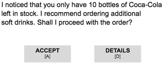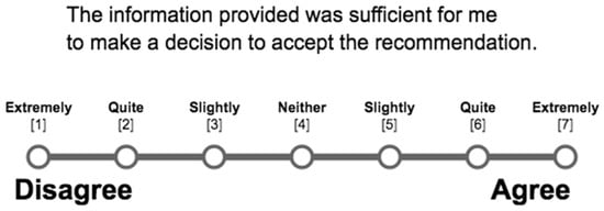 Information sufficiency refers to whether the amount of content presented to the user is enough for the user to understand the information, and in some cases to act on it [28]. By changing the degree of information specificity (i.e., problem and/or solution) and situational complexity, the amount of information available, and the way the information is conveyed to the user, user perceptions of information are likely to be augmented [20,21,22]. To ensure that information is clear and easy to access, which will improve information sufficiency, the information should be structured and adapted to the needs of the receivers [26,29]. Explanations in a recommendation have an important impact on the user’s behavior. Indeed, the type of explanation has a direct effect on RS use and should be different according to the desired effect [30]. For example, persuasive explanation supports the competence facet of the RS [30], while negative arguments increase the user’s perceived honesty of the system regarding the recommendation [31]. Moreover, fact-based explanations (i.e., only facts with keywords) and argumentative explanations are preferred by users over full-sentence explanations [32]. The literature recommends proposing recommendations with only pertinent and cogent information [33] and excluding all information and knowledge that are not relevant for answering the request [33]. Long and strongly confident explanations can also be used to increase user acceptance [34]. Thus, choices regarding message (text) styling and information sequence may make it easier for the user to understand the presented information, and a change in information sufficiency may also be observed [25].