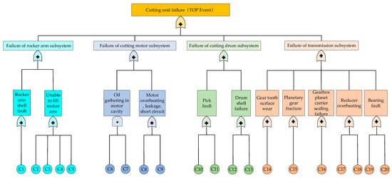 A fault tree model is an effective method to analyze the relationship between the top event and bottom events in the quantitative method [27]. The fault tree analysis of the shearer-cutting unit mainly includes constructing the fault tree model of the cutting unit and evaluating the probability of the bottom events.