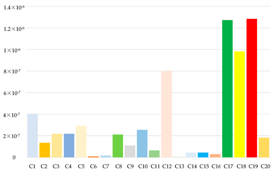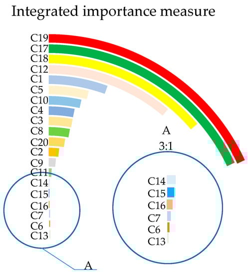 According to Table 4, the IIM of each bottom event can be evaluated by Equation (1). The IIM results of 20 bottom events are listed in Table 5 and Figure 5. IIM ranking results from the largest to the smallest: C19 > C17 > C18 > C12 > C1 > C5 > C10 > C4 > C3 > C8 > C20 > C2 > C9 > C11 > C14 > C15 > C16 > C7 > C6 > C13. Under the limited maintenance resources, the bottom events C19 (bearing wear), C17 (nonconformity of oil varieties or improper oil quantity), and C18 (cooling spray function failure) should be repaired as priorities.