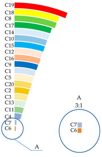 The radial bar chart can clearly show the ranking results of importance measures, which can effectively identify the bottom events of high importance. To analyze the ranking and distribution of various IMs, the calculation results of 20 bottom events were normalized, and the ranking of different importance measures is analyzed in the radial bar chart. If the importance of the bottom event is greater, the bottom event is outside the radial bar chart. The radial bar charts of IIM, BIM, CIM, and FVIM are shown in Figure 6, Figure 7, Figure 8 and Figure 9, respectively.