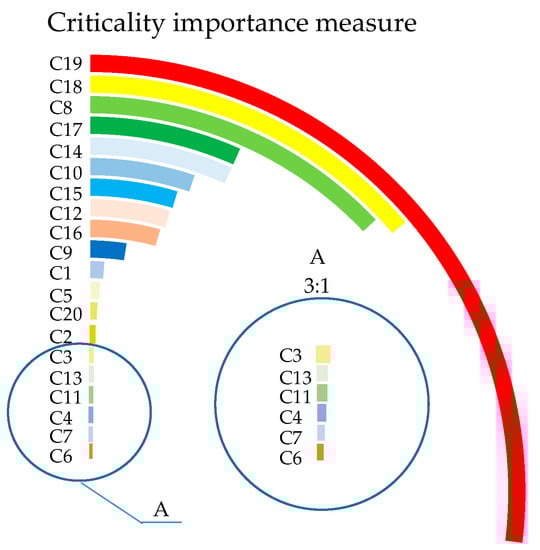 BIM, CIM, and FVIM are calculated by Equations (2)–(4), respectively. The calculation results of the four importance measures are shown in Table 6. We can find that BIM and FVIM are concentrated in the order of 0.1, CIM results are concentrated in the order of 0.01, and IIM is concentrated in the order of 10 × 10−07. As an indicator of identifying the weakest links in the system, IM focuses on its relative importance level. Moreover, the BIM ranking in descending order is C19 > C18 > C8 > C17 > C14 > C10 > C15 > C12 > C16 > C9 > C1 > C5 > C20 > C2 > C3 > C13 >C11 > C4 > C7 > C6. Under the condition of limited maintenance resources, the bottom events C19 (bearing wear), C17 (nonconformity of oil varieties or improper oil quantity), and C18 (cooling spray function failure) should be repaired as priorities. The CIM ranking in descending order is C19 > C18 > C8 > C17 > C14 > C10 > C15 > C12 > C16 > C9 > C1 > C5 > C20 > C2 > C3 > C13 >C11 > C4 > C7 > C6. Given the limited maintenance resources, the bottom events C19 (bearing wear), C18 (cooling spray function failure), and C8 (short circuit between coils, water in connection cavity, dampened circuit) should be repaired as priorities. The FVIM ranking in descending order is C15 > C19 > C18 > C8 >C17 >C14 > C10 > C12 > C16 > C9 > C1 > C5 > C20 > C2 > C3 > C13 >C11 > C4 > C7 > C6. With limited maintenance resources, the bottom events C15 (fatigue damage, gearbox dry friction or particle contamination), C19 (bearing wear), and C8 (short circuit between coils, water in connection cavity, dampened circuit) should be prioritized for repair.