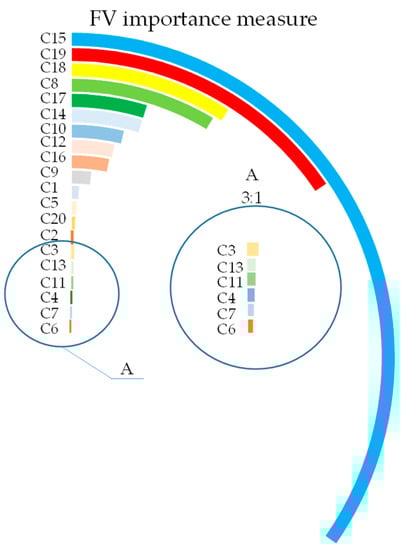 From the perspective of the relative importance distribution of four importance measures, in Figure 7, except for C6 (oil seal leakage) and C7 (oil spill blockage), the BIM ranking of other bottom events is very close, and the ranking results of BIM cannot be intuitively distinguished. Comparing Figure 7 and Figure 8, the ranking results of BIM and CIM are the same, but the bottom events of CIM can be distinguished clearly because the gap between maxima and minima is narrow. So, the relative value of CIM makes it easier to distinguish key fault causes compared to BIM. From Figure 6 and Figure 9, the relative values of IIM and FVIM can clearly distinguish the importance of bottom events. However, C15 (fatigue damage, gearbox dry friction or particle contamination) in FVIM is too large, which makes it difficult to distinguish the importance measure of other bottom events with lower FVIM. Therefore, the relative value distribution of the four importance measure rankings shows that IIM and CIM can clearly distinguish the relative importance of bottom events.