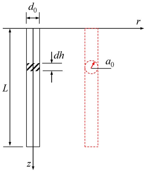 Based on the Winkler foundation model, The concept model for the response of the existing pile caused by adjacent pile driving is shown in Figure 4. The penetrated depth and diameter of the new pile are respectively L and d0; the depth and diameter of the existing pile are H and D0, respectively.