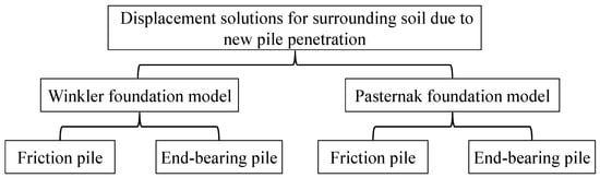 Field measurements and theoretical research [,,] show that the penetration of the static-pressure pile mainly causes radial displacement of the soil around the pile. Therefore, the penetration of the new pile will cause lateral compression on the old pile and will not cause pile torsion. One of the key steps to analyze the stress and deformation of the old pile is to obtain the radial displacement of the soil around the new pile.