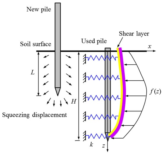 The Winkler foundation model fails to account for soil continuity. To this end, based on the Pasternak foundation model, a mathematical model for reflecting the response of the existing pile is proposed in this section. Another mechanical model of the existing pile under new pile penetration based on the Pasternak foundation model is proposed, as shown in Figure 5.