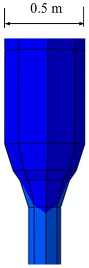 In this section, a 3D numerical model of the existing pile under new pile penetration is employed, as shown in Figure 6. The soil is 30 m high with a radius of 10 m. The new pile has a diameter of 0.5 m and a length of 20 m. The new pile penetrates at the center of the soil. The existing pile has a length of 20 m and a diameter of 0.5 m. The existing pile’s center is 2 m away from the new pile’s penetration position, which is 4 times the diameter of the pile. To ensure computational stability, the model is presented with a small hole with a radius of 0.1 m at the center of the new pile’s penetration position, and an auxiliary pipe with a radius of 0.1 m is added at the bottom of the pile end, as shown in Figure 7. Thus, the equivalent radius of the new pile model can be calculated as: