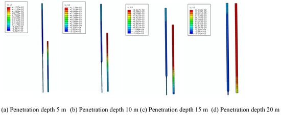 Figure 8 shows the lateral displacement of the existing pile at 5 m, 10 m, 15 m and 20 m of new pile penetration. It can be seen from Figure 8 that the existing pile causes lateral displacement away from the new pile as the new pile penetrates, and the deeper the penetration, the greater the lateral displacement. This is attributable to the significant squeezing impact induced by the new pile’s penetration.