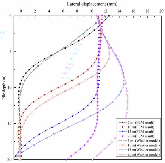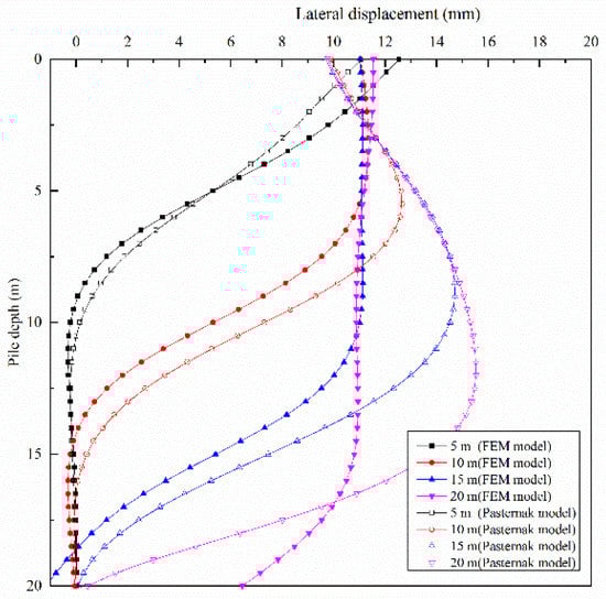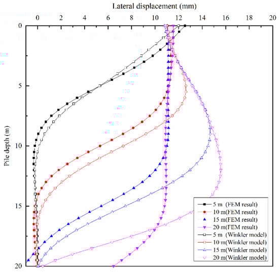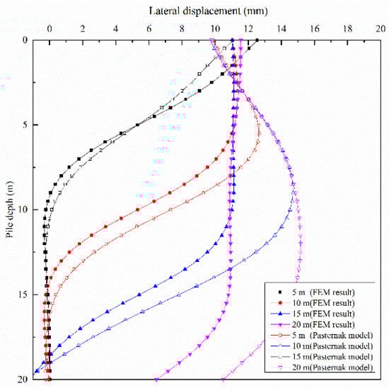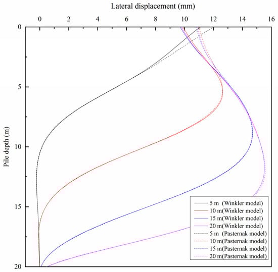 From Figure 9, Figure 10, Figure 11 and Figure 12, it can be found that the difference between the results of the two analytical models is mainly in the deformation near the top of the existing pile. Figure 13 displays the comparison of lateral deformation of the existing pile body between the Winkler foundation model and the Pasternak foundation model. It is worth noting that the lateral deformation of the existing pile body computed by the Pasternak foundation model is larger than the results of the Winkler foundation model, which is compatible with the findings of Liang et al. [].