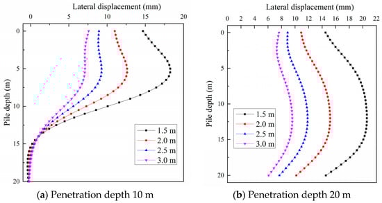 It can be seen that the lateral displacement generated by an existing pile increases significantly as the distance decreases. Furthermore, when the distance is short, the existing pile’s lateral displacement grows dramatically with increasing distance. At 10 m pile penetration, when the distance was lowered from 2 m to 1.5 m, the maximum value of lateral displacement of existing piles increased by 5.65 mm, from 12.62 mm to 18.27 mm; meanwhile, when the distance was reduced from 3 m to 2.5 m, the maximum value of lateral displacement increased by only 2.16 mm, from 7.11 to 9.27 mm. At 20 m pile penetration, the highest lateral displacement of the existing pile rose from 15.17 mm to 20.61 mm, with a 5.47 mm rise when the distance is lowered from 2 m to 1.5 m; when the distance was lowered from 3 m to 2.5 m, the highest lateral displacement rose by just 2.06 mm, from 9.78 mm to 11.84 mm (as shown in Table 2). This indicates that increasing the spacing between the existing pile and the new pile has a major impact on minimizing the squeezing effect. Too small a distance will affect the bearing capacity of existing piles.