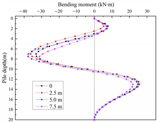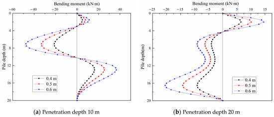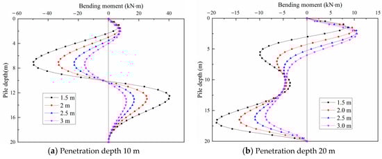 Figure 17a,b show the bending moment of the existing pile at 10 m and 20 m of new pile penetration, respectively. The two figures show that the bending moment of the existing pile also increases as the diameter of the new pile increases. It is worth noting that the change in the diameter of the new pile has no effect on the distribution and neutral point of the bending moment of the existing pile.