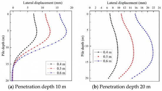 According to Figure 16, when the diameter of the pile increases, the lateral displacement of the present pile increases dramatically. At 10 m of pile penetration, when the pile diameter was enlarged from 0.4 m to 0.5 m, the maximum lateral displacement of the existing pile increased by 4.54 mm, from 8.08 mm to 12.62 mm; when the pile diameter was extended from 0.5 m to 0.6 m, the maximum value of lateral displacement rose by 5.55 mm, from 12.62 mm to 18.17 mm. At 20 m of pile penetration, when the pile diameter was expanded from 0.4 m to 0.5 m, the maximum lateral displacement of the existing pile rose by 5.46 mm, from 9.71 mm to 15.17 mm; when the pile diameter was extended from 0.5 m to 0.6 m, the maximum value of lateral displacement rose by 6.68 mm, from 15.17 mm to 21.85 mm. The Table 3 exhibits the lateral displacement variation due to diameter variation of new pile. The results suggest that lowering the pile diameter is more significantly effective than increasing the piles’ spacing in minimizing the squeezing effect, and slender piles are recommended for new piles, as shown in Table 3.