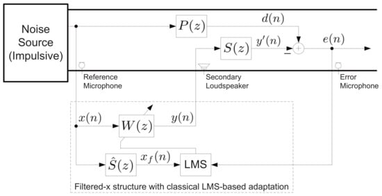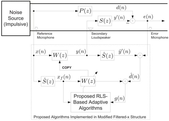 which requires the previous coefficient vector and information about . Unfortunately, the latter is present only in the acoustic domain and is not directly accessible. Another important issue to circumvent is the poor numerical stability of the classical FxRLS algorithm for ANC systems [3,18]. Nevertheless, it is well-known that RLS-based adaptive filters exhibit faster convergence compared to the stochastic-gradient-based LMS adaptive filters, though at a cost of increased computational complexity. Considering that modern digital hardware allow implementing complex algorithms, it is worth developing FxRLS-based adaptive filtering solutions for practical applications. In the following- we explore developing a new FxRLS algorithm based an an objective function well suited for impulsive ANC systems.