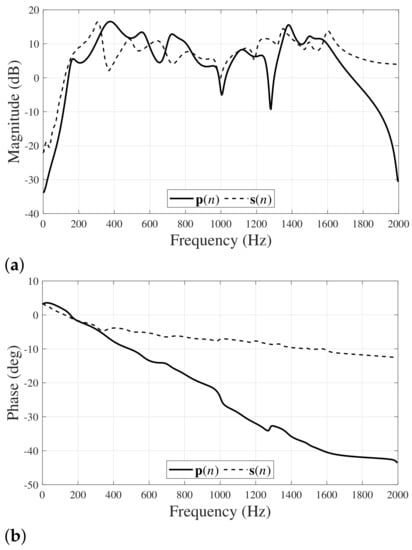 Frequency response characteristics of FIR models for acoustic paths used in computer simulations: (a) Magnitude response characteristics, and (b) phase response characteristics.